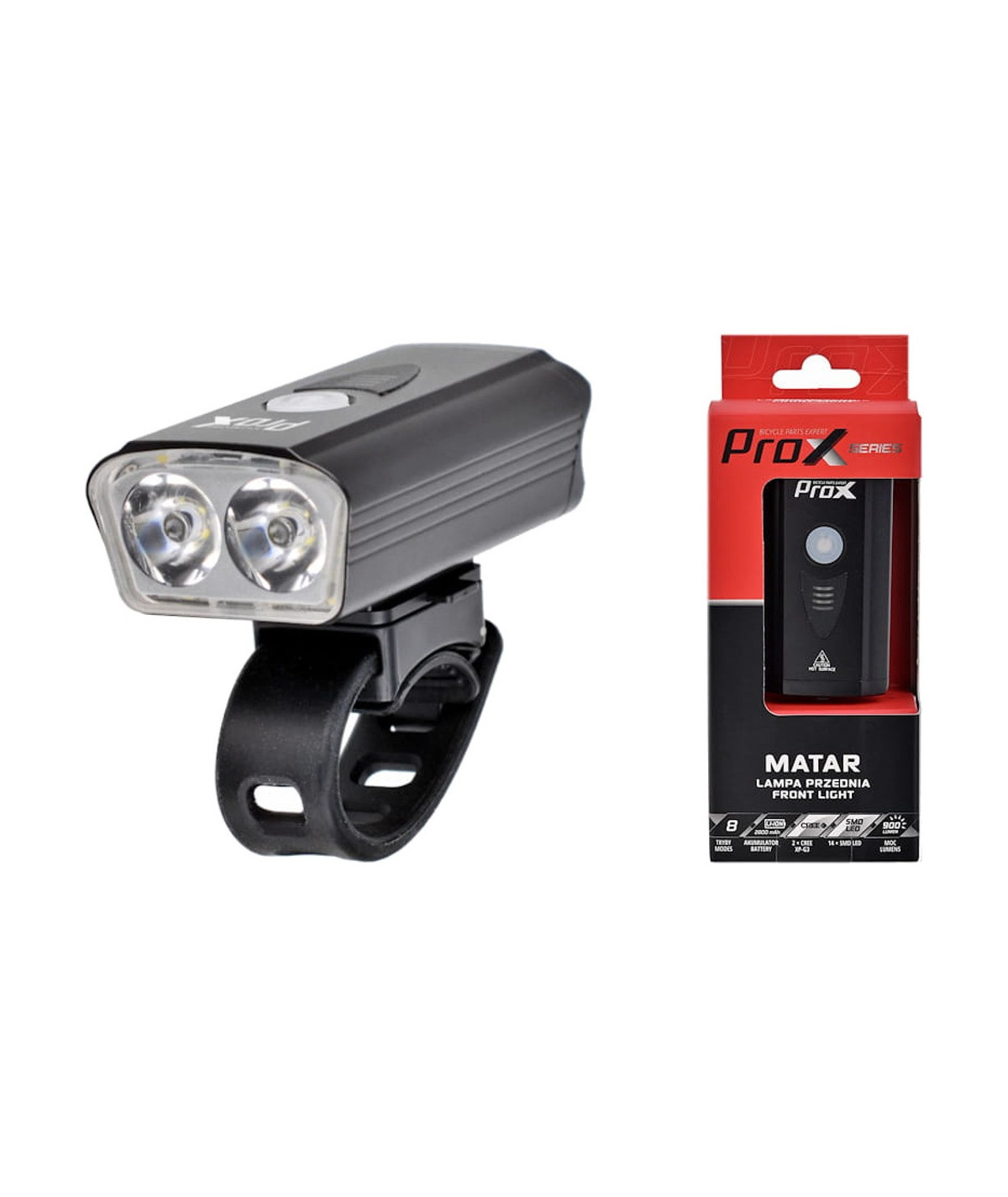 Prox Matar to przednia lampa rowerowa wyposażona w dwie mocne diody typu CREE XP-G3 LED. Dzięki specjalnie skonstruowanym soczewkom, uzyskano snopu światła o dalekim zasięgu oraz szerokim kącie padania. Takie rozwiązanie przekłada się na efektywne oświetlenie drogi na całej szerokości i pozwala na uniknięcie potencjalnych zagrożeń od strony pobocza.