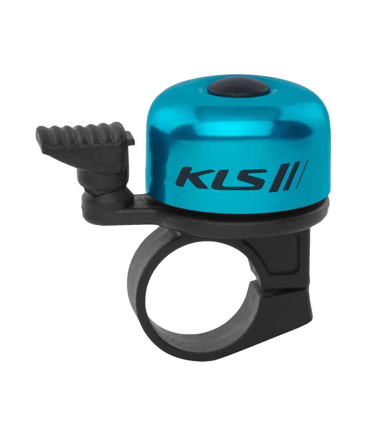 Aluminiowy dzwonek rowerowy niewielkiej wielkości Kellys montowany na kierownicy za pomocą obejmy ze śrubką.