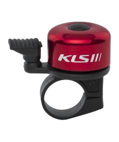Aluminiowy dzwonek rowerowy niewielkiej wielkości Kellys montowany na kierownicy za pomocą obejmy ze śrubką.